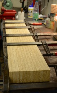 Während die Balken, von denen wir vier Stück gebaut haben, ausgehärtet sind, haben wir festgelegt, an welchen Stellen der Bodenplatte sie die beste Stabilität für die Kiste bieten. Diese Balken verlaufen parallel zur kurzen Seite und halten zudem auch die beiden Bodenplatten (84 cm x 225 cm) zusammen.
