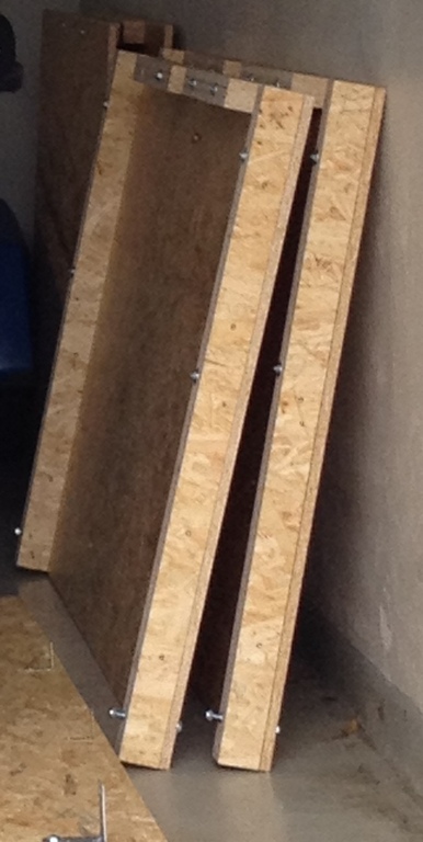 Die kurze Seite (125 x 168 cm), die ebenfalls am oberen Ende einen Balken zur Auflage des Deckels bekommen hat, haben wir dann nur auf die Bodenbalken aufsetzen müssen und mit 80-er Holzschrauben angeschraubt. Alle Platten (Seiten, Boden und Deckel) haben wir übrigens beschriftet, damit beim erneuten Zusammenbauen alles wieder an seinen Platz kommt.